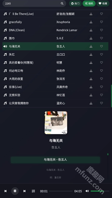用户能够借助输入歌曲名称、歌手名字等方式,快速且精准地定位到想要找的音乐;搜索结果里还会呈现出歌曲时长、热度等相关信息,便于用户进行筛选。