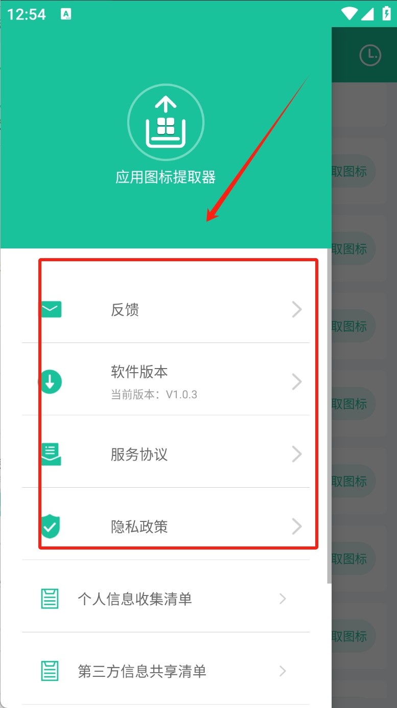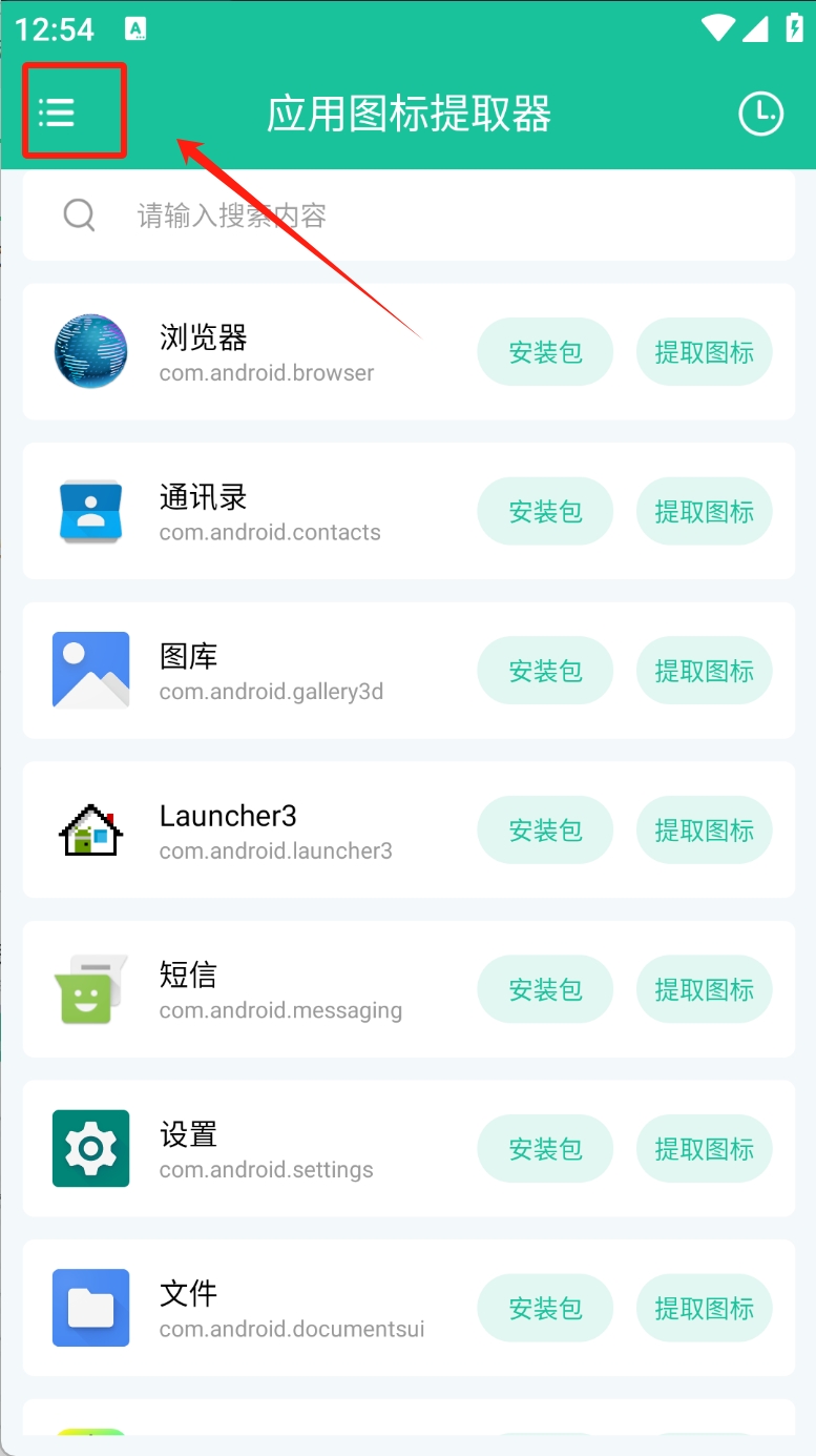1、点击左上角的菜单按钮,打开应用图标提取器的侧边菜单。