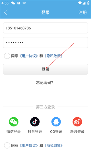 4、输入账号密码后,勾选“同意《用户协议》和《隐私政策》”,点击“登录”完成账号验证。