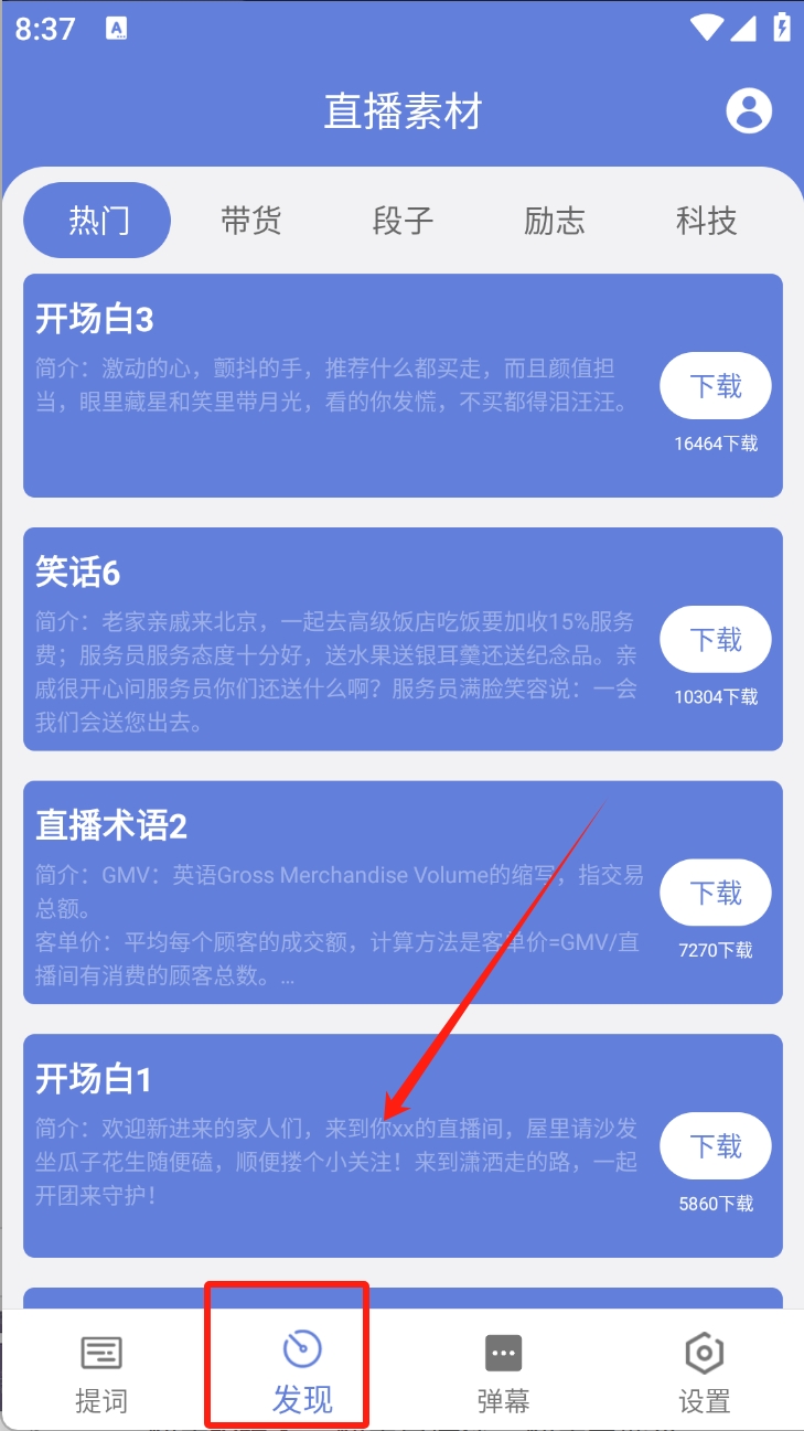 2、点击“发现”按钮,浏览热门开场白、笑话等直播素材,并选择下载。