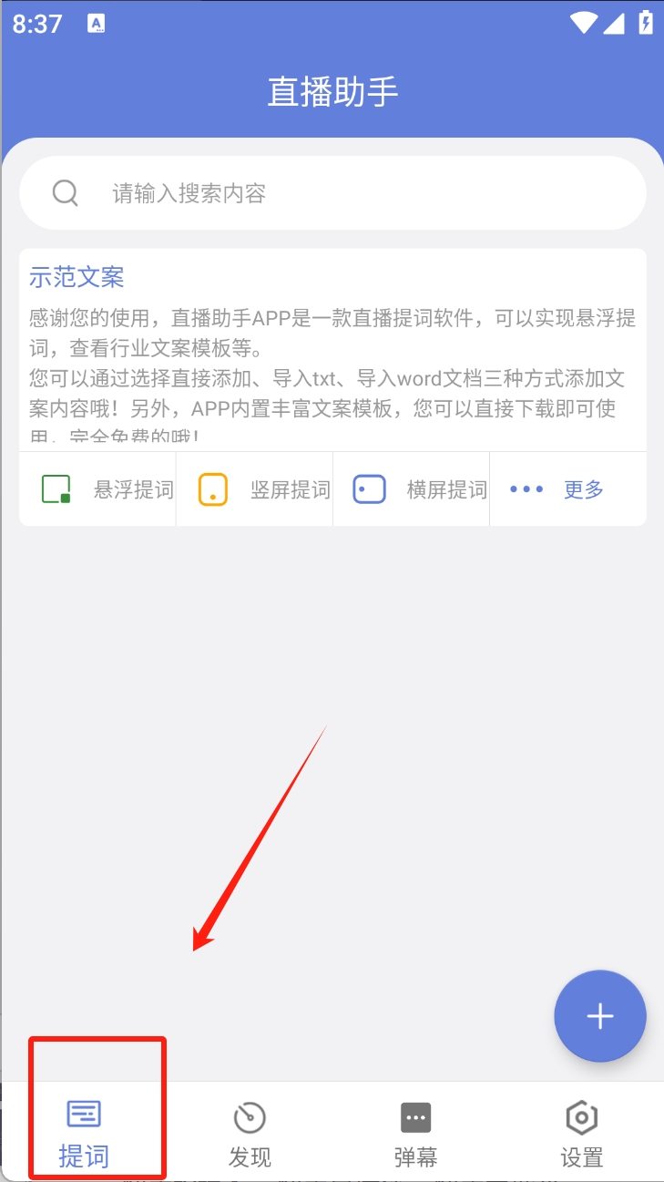1、点击“提词”按钮,进入提词功能界面,查看悬浮提词、竖屏提词等选项。