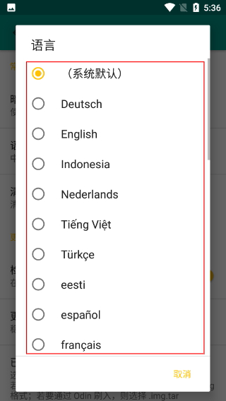 4、在语言列表中,可选择“(系统默认)”“Deutsch(德语)”“English(英语)”等语言,选择后应用会切换为对应语言显示界面。