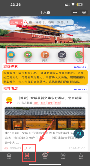 2、点击“北京”进入城市页,查看旅游锦囊与官方推荐酒店详情。