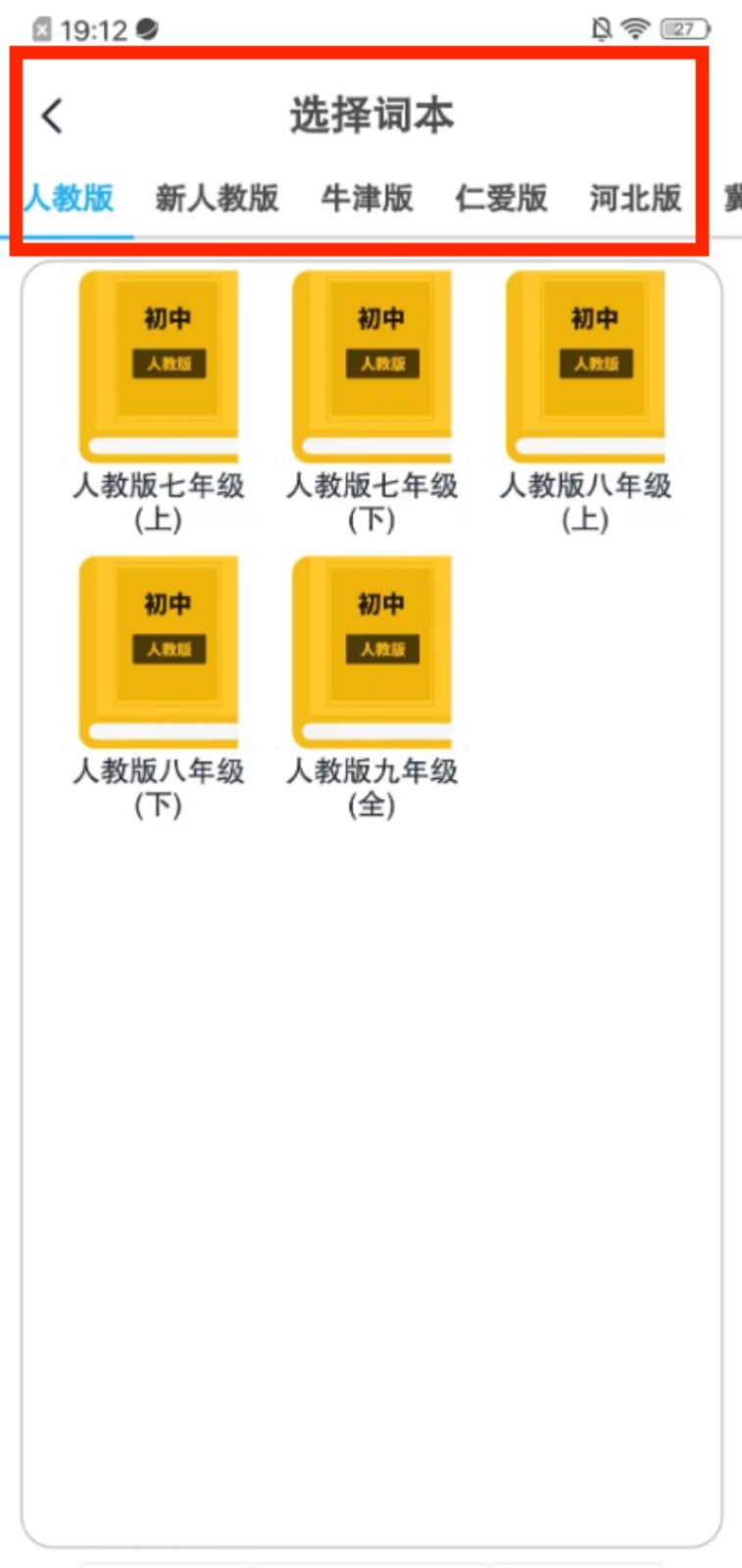 1、进入 “选择词本” 页面,挑选对应教材版本与年级的词本,确定学习内容范围。