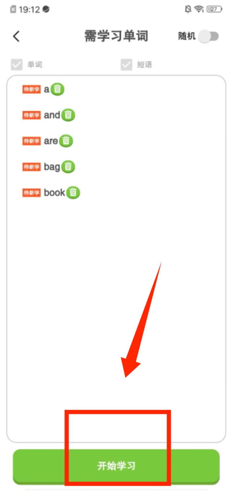 3、在需学习单词列表页,再次点击 “开始学习”,进入具体的单词学习环节。
