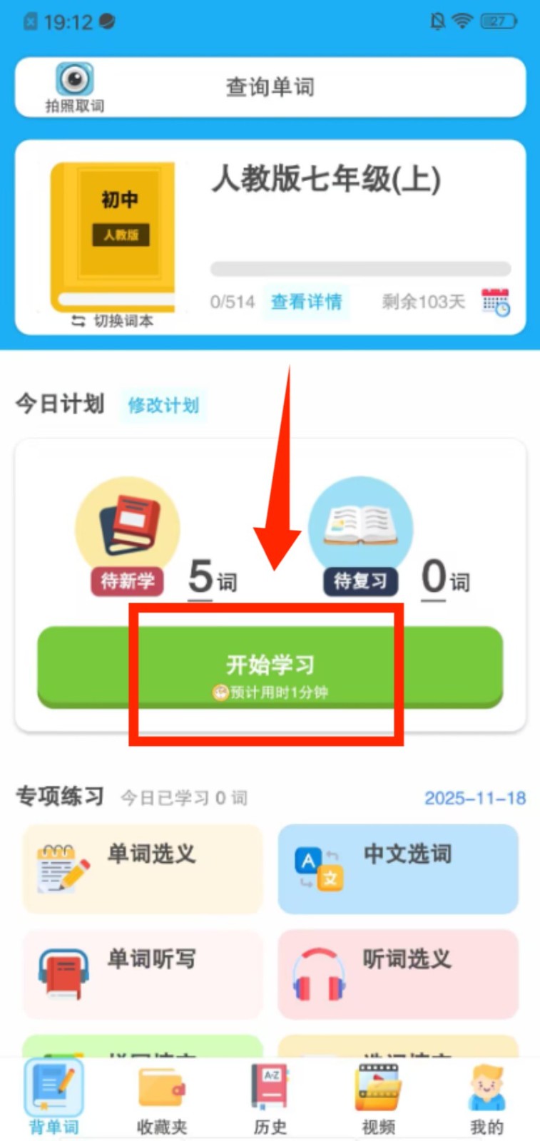 2、选定词本后进入学习页,点击 “开始学习”,即可启动当日的单词学习计划。
