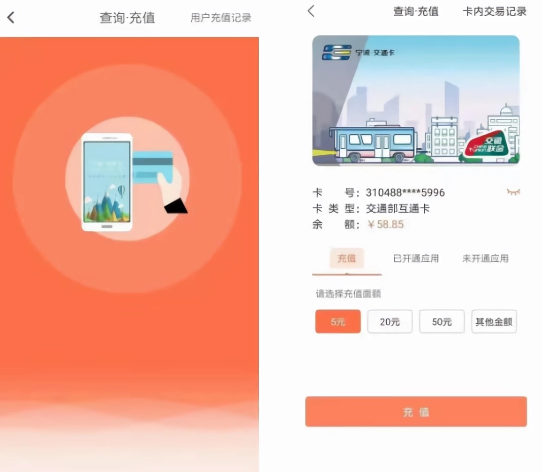 将卡片紧贴手机NFC天线处,识别后会跳转到充值金额选择界面。选择充值金额,然后点击“充值”按钮,跳转到支付界面。