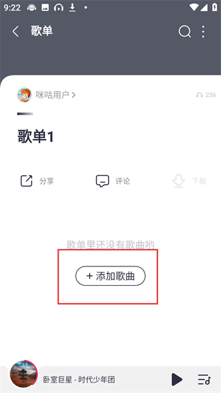 4、进入新建的歌单页后点【添加歌曲】按钮,就能去挑选喜欢的歌曲加入这个歌单啦。