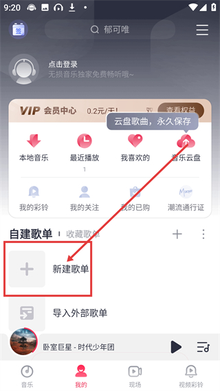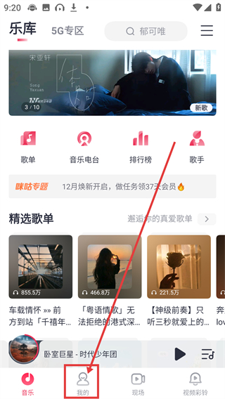 1、在乐库页点底部的【我的】选项,能进入个人中心界面,后续可管理歌单等内容啦。