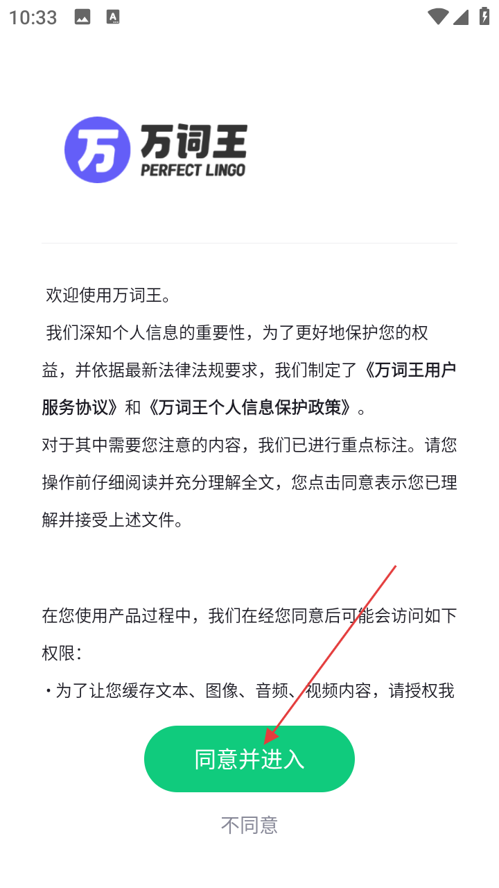 1、首次使用【万词王】,阅读相关协议后,点击【同意并进入】。