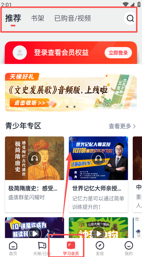 3、打开学习会员页面,在推荐、书架等标签下,浏览青少年专区的内容,选择适配的学习资源。