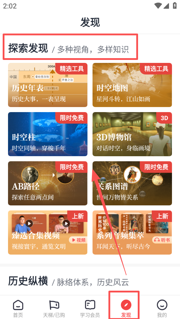 4、进入发现页面,在探索发现板块选择时空地图、3D 博物馆等工具,从多视角获取知识内容。