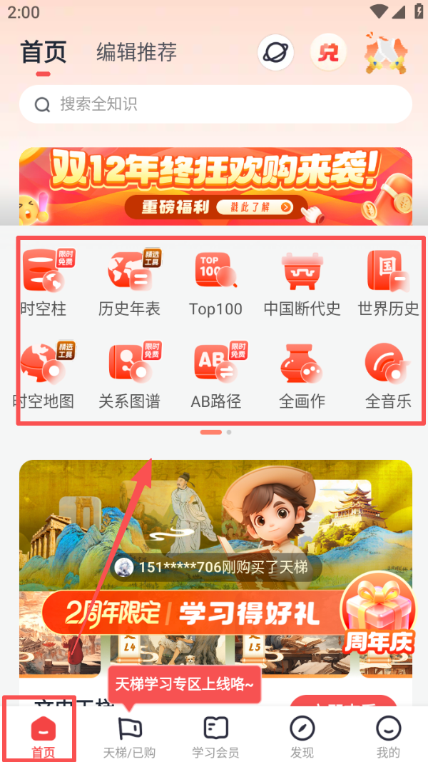 1、进入首页,在功能区选择时空柱、历史年表等工具,借助这些板块获取对应领域的知识内容。