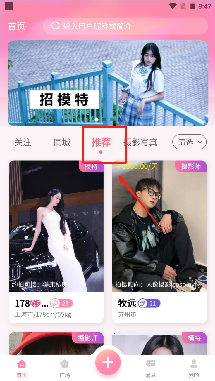 2、浏览推荐模特、在首页界面,点击“推荐”标签,浏览系统为您推荐的模特列表,寻找合适的模特合作。