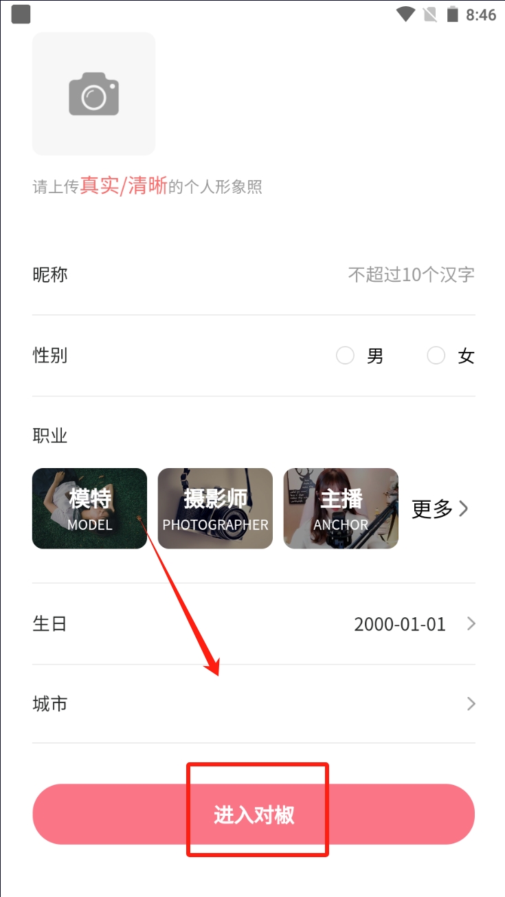 1、填写个人资料、上传真实清晰的个人形象照,填写昵称、性别、职业、生日和城市等信息,点击“进入对椒”完成资料填写。
