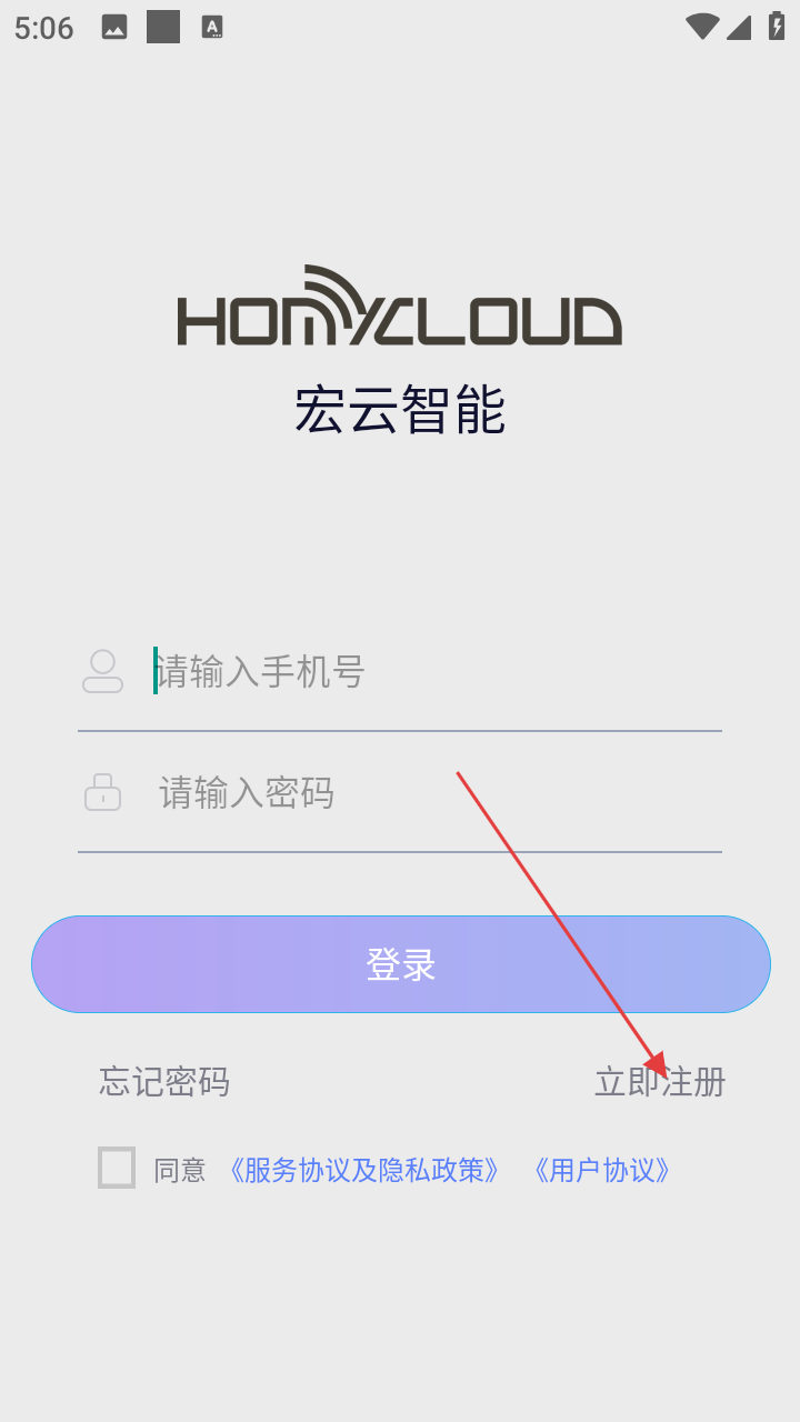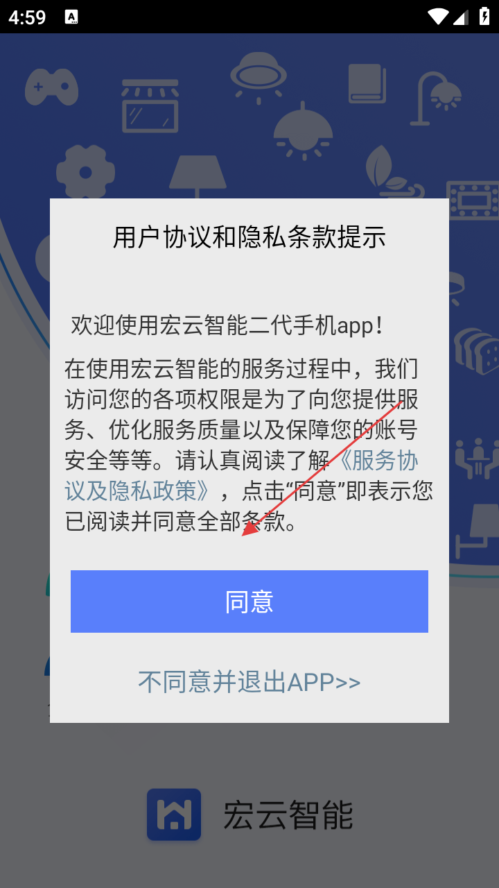 1、打开宏云智能,阅读用户协议弹窗后,点【同意】。