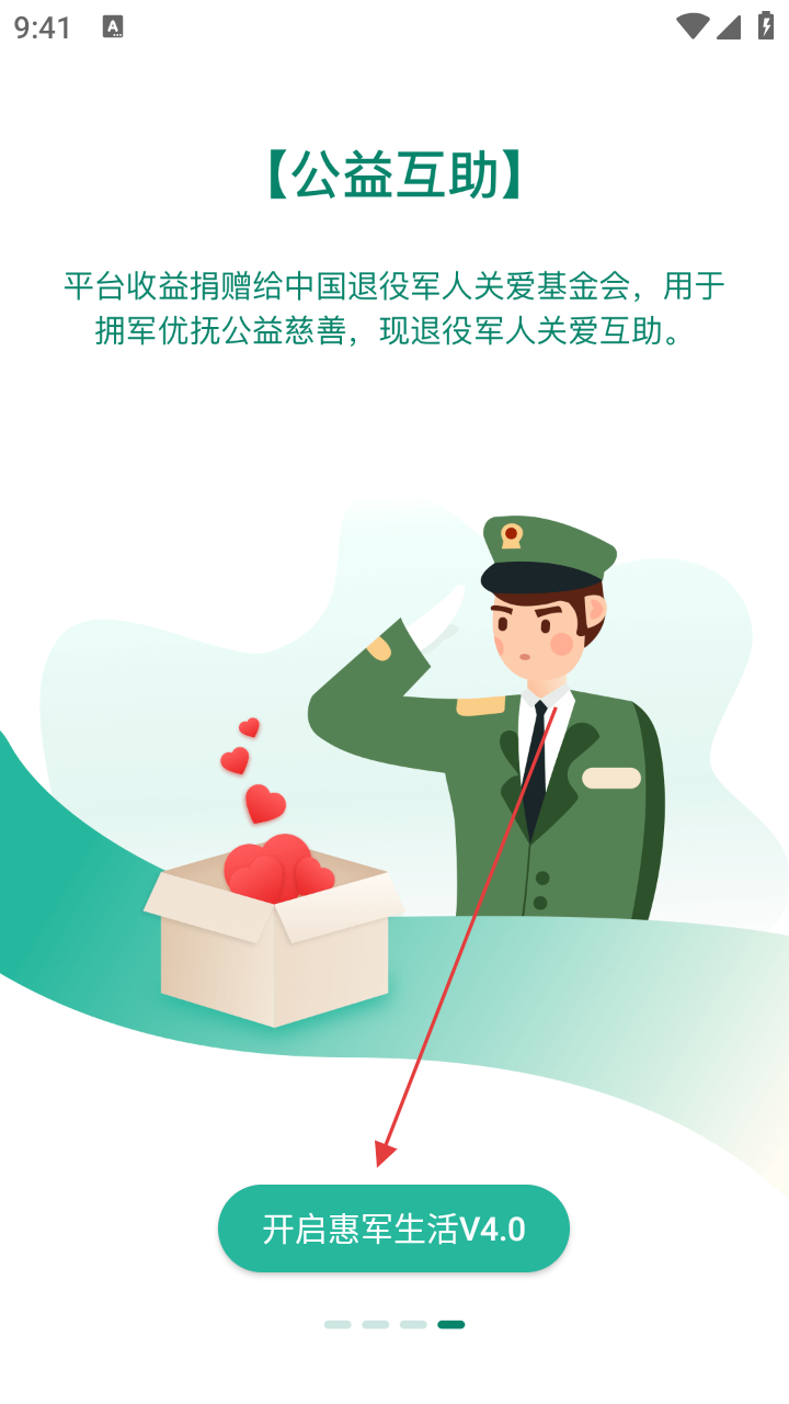 2、同意后进入公益互助介绍页,了解平台收益捐赠用途,点击【开启惠军生活V4.0】。