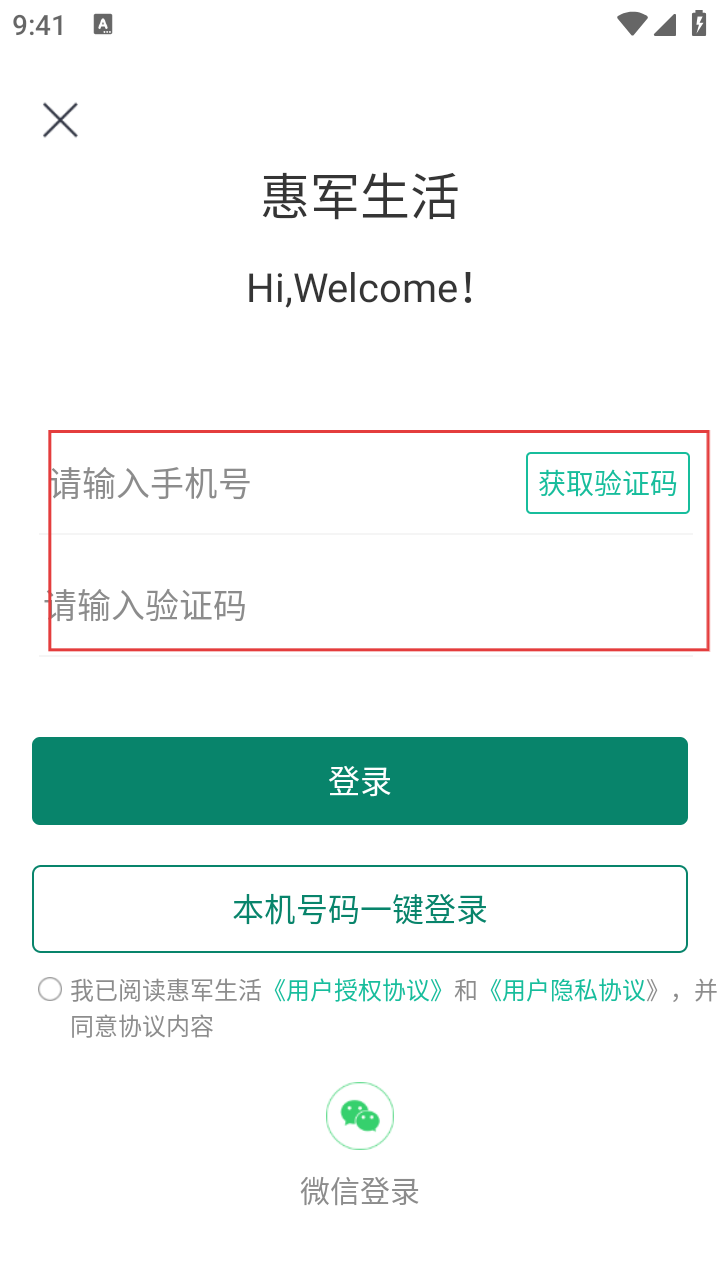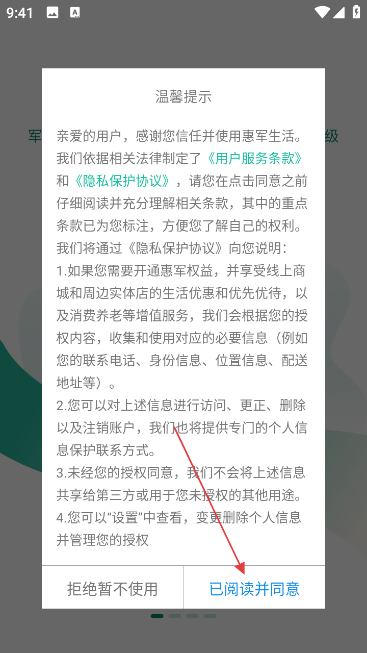 1、打开惠军生活,会弹出温馨提示,仔细阅读《用户服务条款》和《隐私保护协议》后,点击【已阅读并同意】。