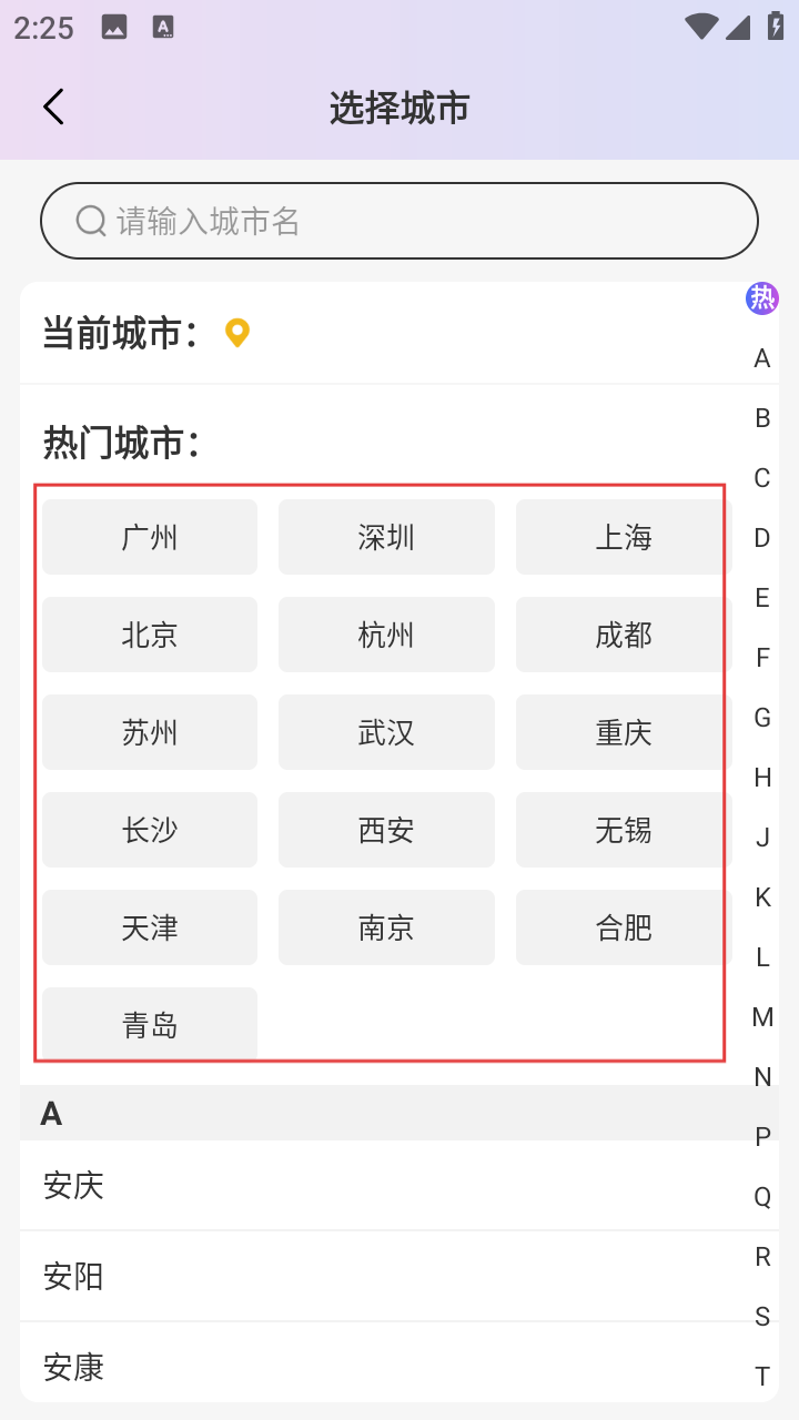 1、进入城市选择页,可从【热门城市】列表,选目标城市,也用搜索框输入查找,选定后进入服务主界面。