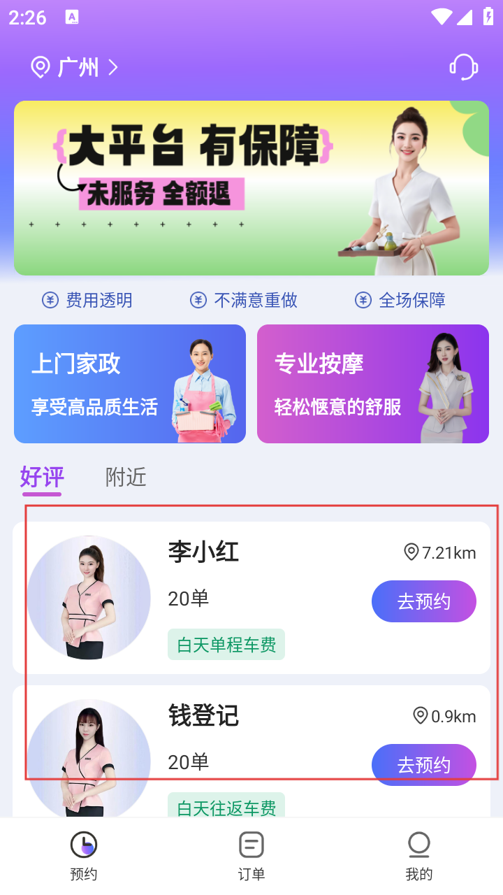 2、在服务主界面,浏览【好评】列表里的服务人员,查看距离、订单数等信息,点击进入技师详情页。