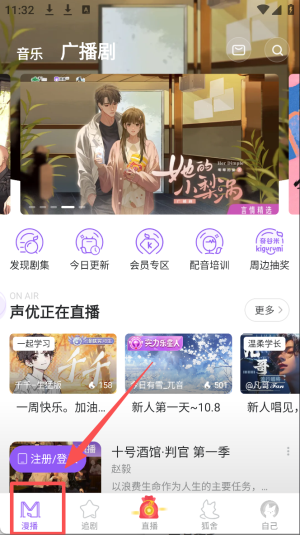 1、点击底部“漫播”标签,进入音频直播和广播剧页面。