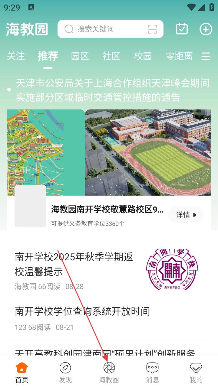 1、进入【海教园】软件首页,能看到各类资讯,点击底部【海教圈】,可进入圈子页面。