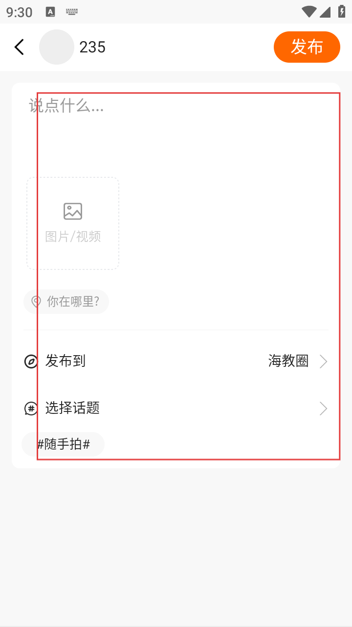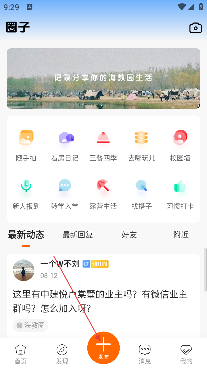 2、在圈子页面,有【随手拍】【看房日记】等功能入口,点击底部橙色【发布】按钮,可准备发布内容。