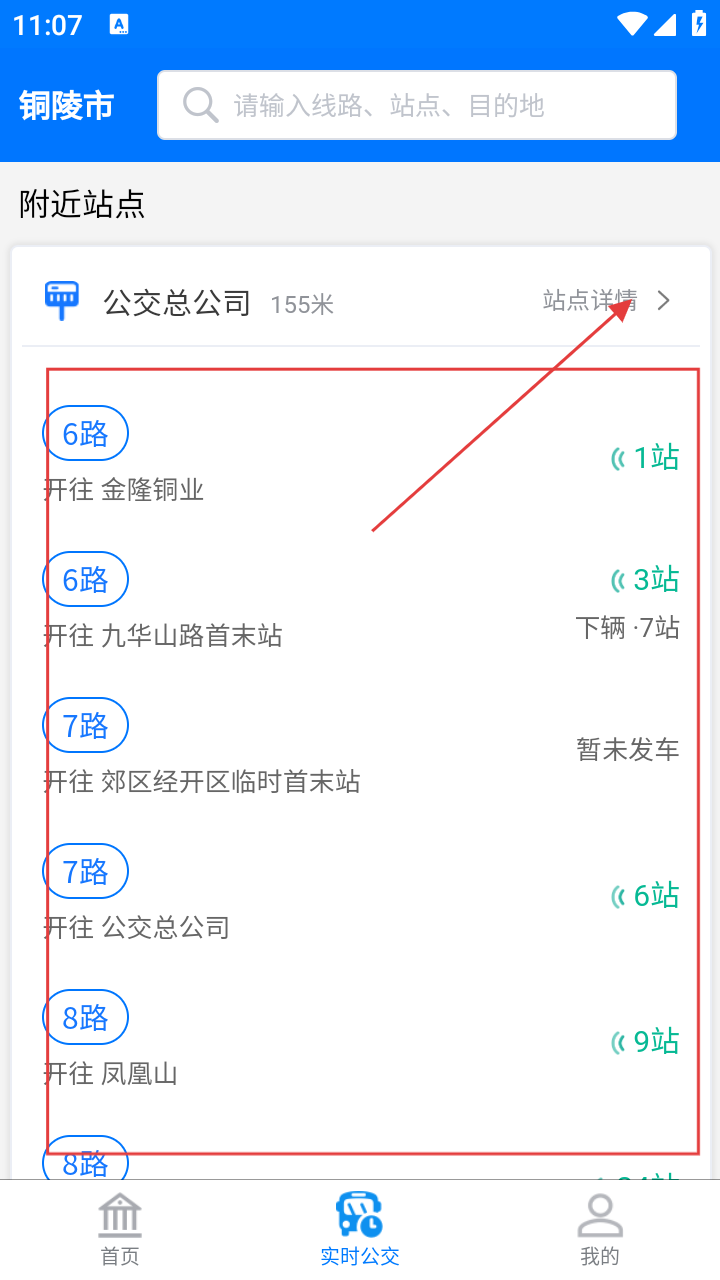 2、在【实时公交】页,选目标站点,点击【站点详情】,进入站点线路页。