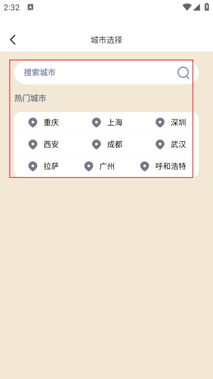 3、进入城市选择页面,可通过搜索或选择热门城市来切换。