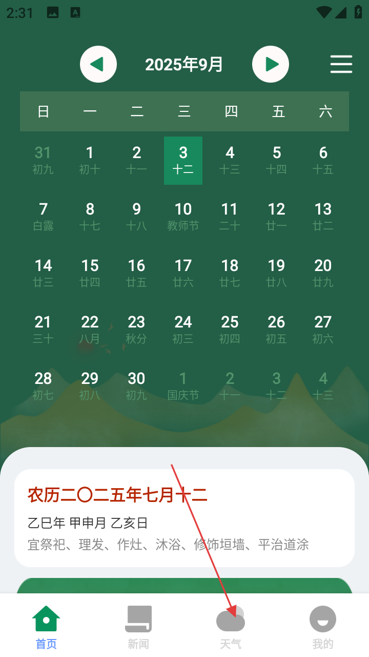 1、打开随游全时通,在首页可查看日期、农历等信息,若要查看天气,点击底部【天气】模块。