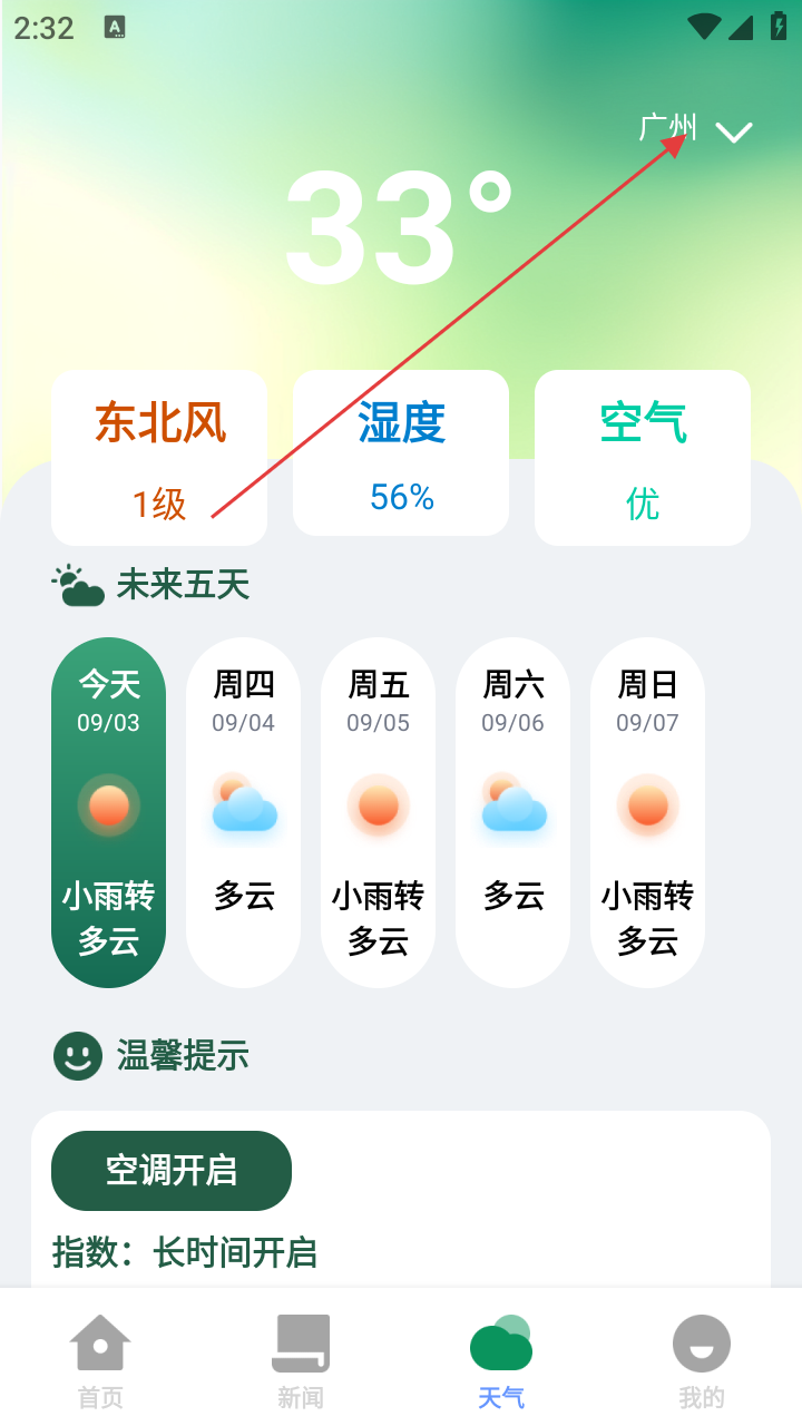 2、在天气页面,可查看当前城市的温度、风向、湿度、空气质量及未来五天天气预报,若要切换城市,点击城市名称旁的下拉箭头。
