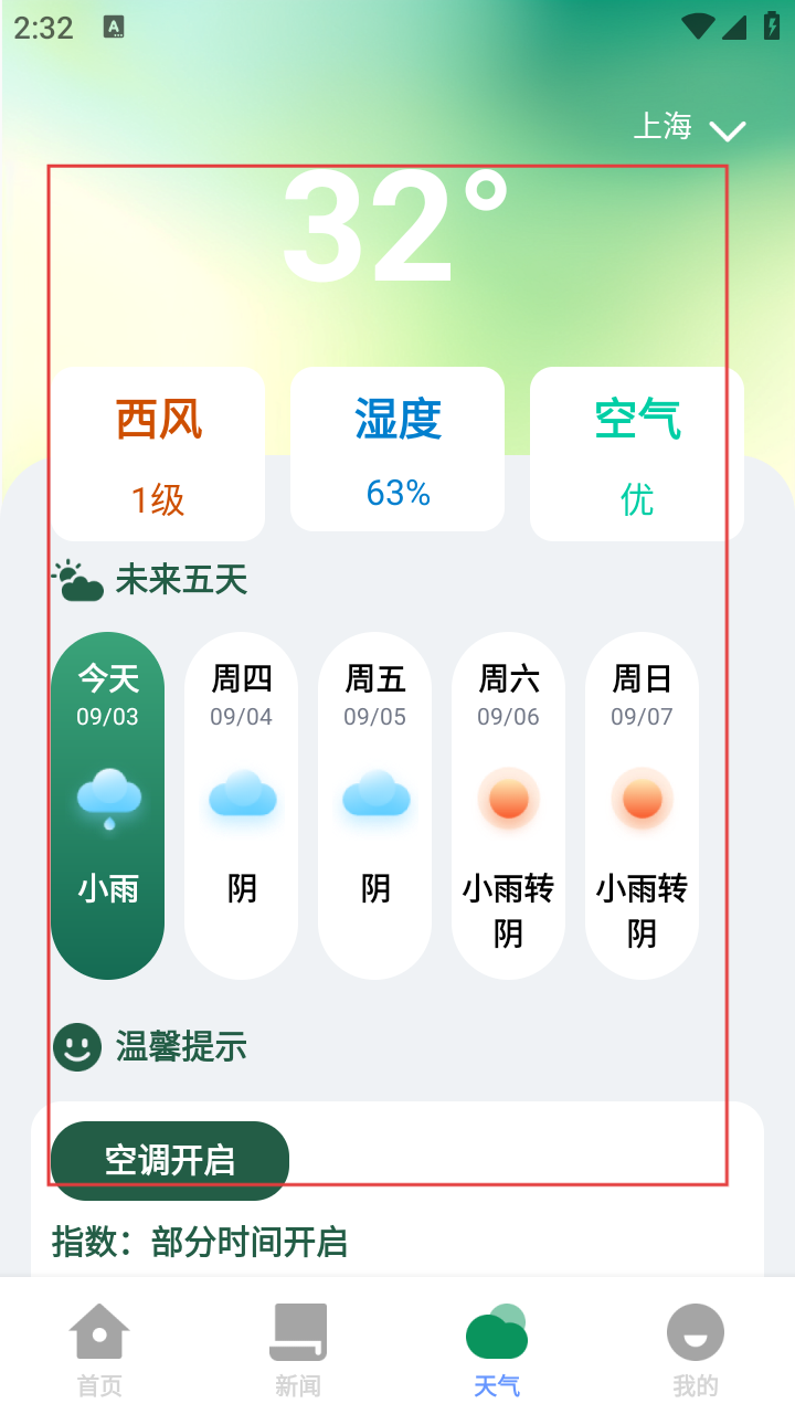 4、天气预报精准实用:提供实时天气、未来五天预报及湿度风向等详细数据,结合生活指数为出行提供可靠参考依据。