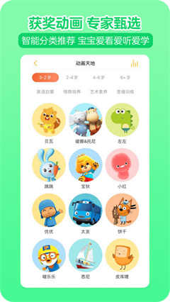 4、【分类】分类明确,朗朗上口的经典儿歌、古诗词、童话故事、生活常识等动画,节奏欢快,语言简单,易学易懂。