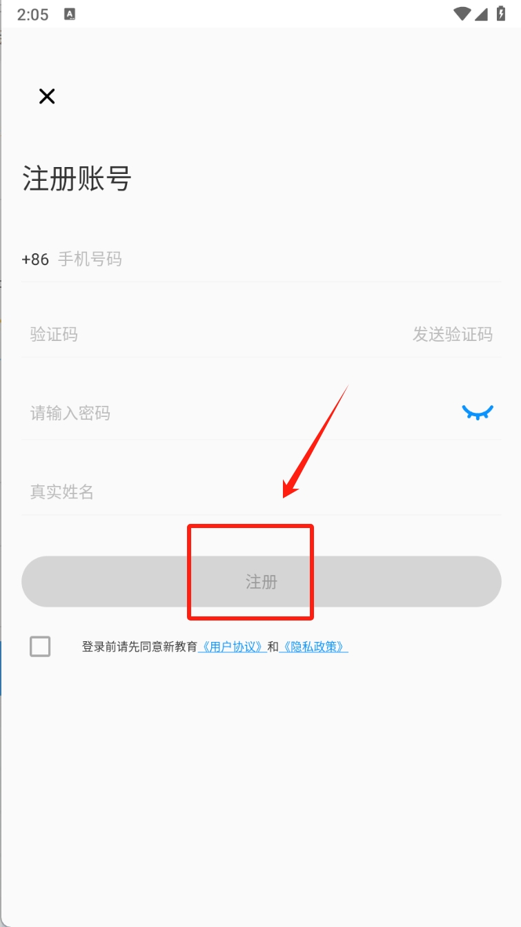 3、在注册页面底部,勾选同意隐私政策,然后点击注册按钮完成注册。