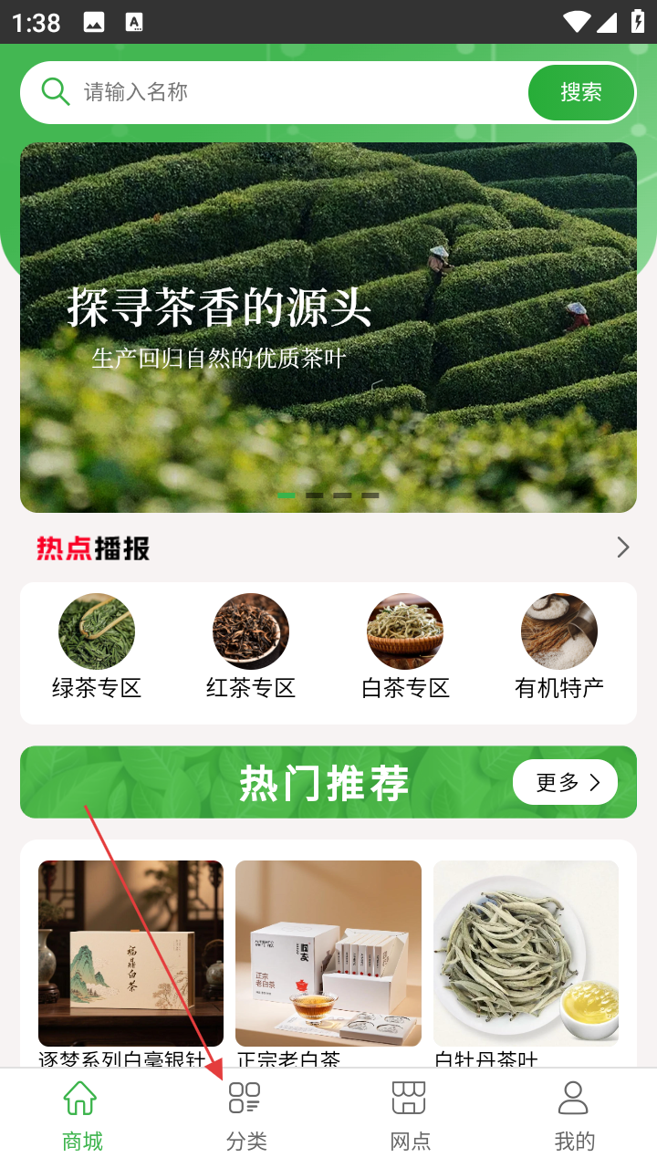 1、进入APP商城页,想找茶叶先点【分类】,能快速定位茶类专区。
