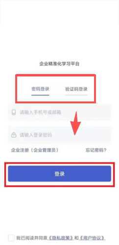 4、回到平台登录页,选择密码登录或验证码登录方式,填入对应账号信息,勾选协议后点击 “登录” 即可进入平台。