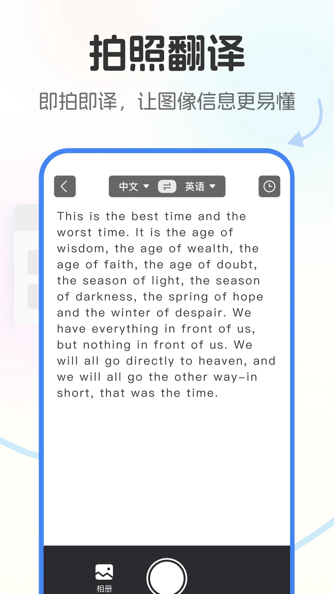 首先为要翻译的文本进行拍照,快速得到翻译结果。