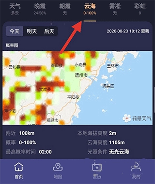 打开天气板块后切换到云海专区,查看本地及周边区域的云海信息。