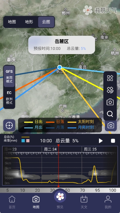 您可以随时查看云图,莉景天气还会为您呈现每日地球与月球的方位变动情况。