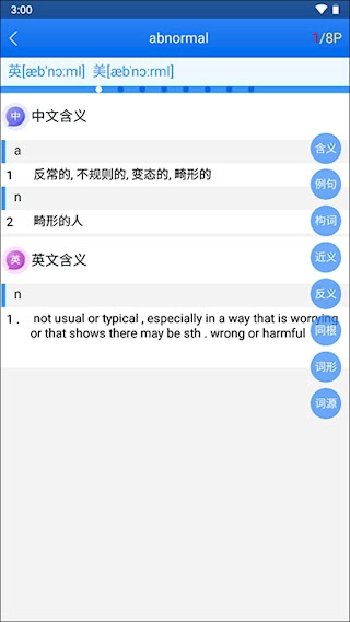 点击“模糊”或“陌生”选项后,系统会跳转至单词的详细解析页面,通过左右滑动屏幕,就能查看该单词的释义、例句、词根分析等相关内容。