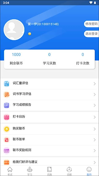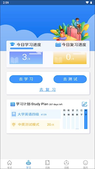 点击学习按钮即可进入学习模块,该模块包含今日学习进度、今日复习进度等内容,同时提供去学习、去测试、去复习等操作选项。