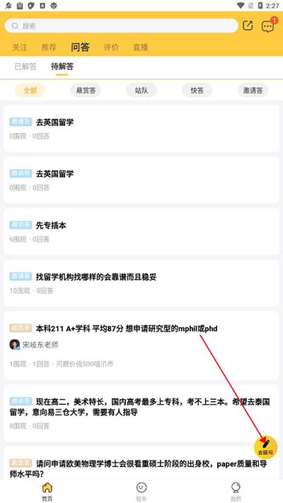 3、进入问答页面后点击右下角的【去提问】。
