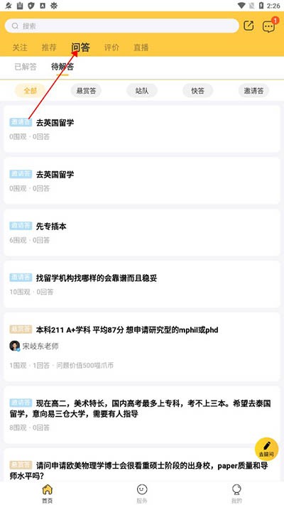 2、进入主页面后点击首页的问答页面。