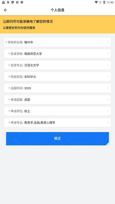 6、进入下一个页面,用户需要补充一些关于留学的基本信息。