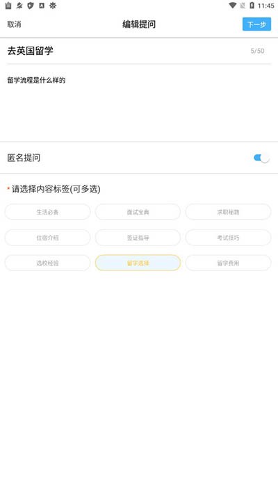 5、以【普通提问】为例,输入问题,选择标签,点击下一步