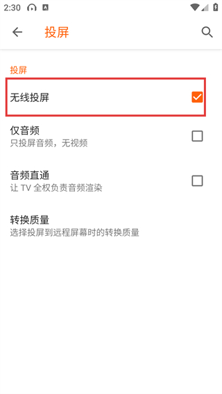 4、【VLC】投屏设置界面,勾选红框标注的【无线投屏】开关,开启无线投屏核心功能。