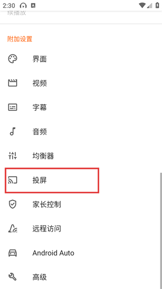 3、【VLC】设置界面的【附加设置】中,点击红框标注的【投屏】选项进入专属设置页。
