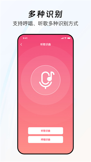 1、高精度听歌识曲: 支持实时录音识别、哼唱识别及外部音频文件导入识别,准确率高,响应速度快。