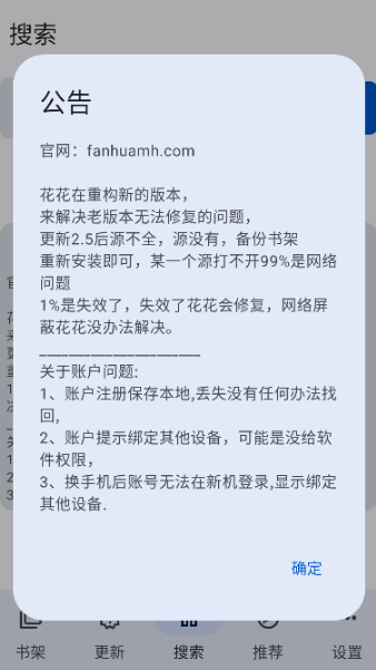 5、正版界面有五个栏目,分别是书架、更新、搜索、推荐、设置,请注意认准。