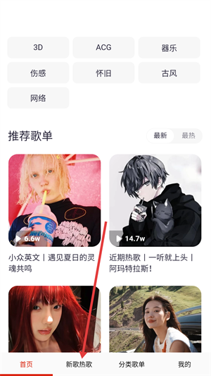 1、在首页底部找到并点击【新歌热歌】按钮,进入新歌热歌界面查看最新歌曲。